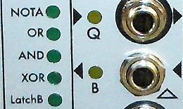 Gate Logic![]() Gate Logic 2201E A variable function logic module for generating and processing gate and trigger signals. Thirty eight different modes cover both two input static gates and clocked logic functions in a comprehensive way applicable for both manual playing and sequencing use. The LFO output is normalled through to input A of the logic section. This may be a voltage controlled LFO/Delay ranging four decades from 0.008Hz (over 2 minutes) to 80Hz, a coarse or fine range voltage controlled BPM clock or a MIDI Clock counter. A manual gate pushbutton, also a separate output, is normalled through to input B of the logic section. This may also be set by a footswitch or MIDI. The output Q is a function of the A and B inputs according to the mode set on the panel or by MIDI Program Change. The functions vary from simple gating to latches and counters. All panel inputs will accept analogue signals with slow edges and have hysteresis to prevent false triggering. All panel outputs may be standard 5V or 10V gate levels or combined Gate & Trigger. Features