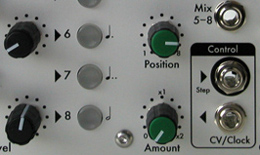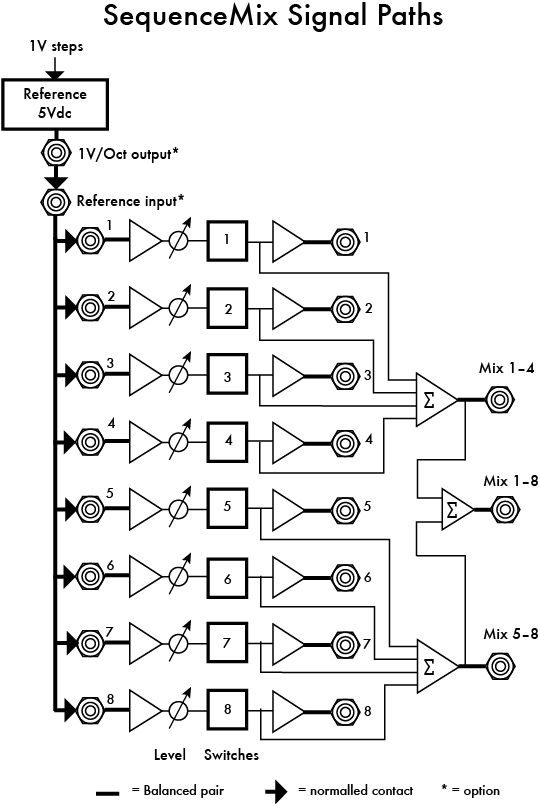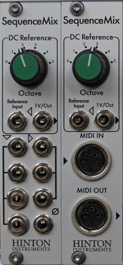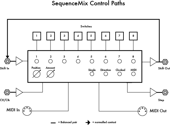 SequenceMix™An eight channel expandable switched mixer controlled by a rotating shift register pattern. Each switch channel has an individual output with the switch status controlled by an illuminated pushbutton. The pushbuttons form a variable length (1-8) shift register which may be shifted in either direction by either an analogue or MIDI clock or addressed by a control voltage. The pushbuttons may be set manually or by MIDI Note On messages. In its simplest application SequenceMix may be used as an 8 step sequencer, or 2x 4 steps, but with a little patching it becomes something much more sophisticated. Two or more SequenceMixes expand the possibilities to include slaving, ganging, nesting and longer patterns.