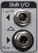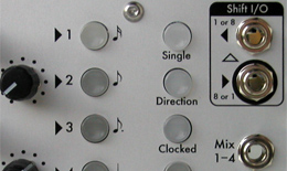 ClockedWhen set the CV/Clock input functions as an analogue clock which may be divided. When clear the CV/Clock input functions as a control voltage addressing the step number which is added to the Position knob setting. When held the red pushbuttons show or set the clock divider 1 to 8. When held with Direction the red pushbuttons show or set the Preset pattern loaded on MIDI Start. MIDIWhen set enables MIDI reception. When held the red pushbuttons set the octave that the switches are mapped to. The other green buttons show or set MIDI note and clock control. When held with Clocked the red pushbuttons show or set the MIDI clock divider from sixteenth to half notes. When held with Single the red pushbuttons 1-4 show or set the MIDI channel (in binary). Control I/O![]() Shift InIf >1.6V an On state is clocked into the shift register on the next clock. This is normalled from Shift Out to create a loop, but may be patched from another SequenceMix or other Gate sources. Shift OutA 5V Gate signal of the same state as the Nth Switch in forwards or Switch 1 in reverse. ![]() Step Clock OutA 5V Trigger signal whenever the register is shifted. CV/Clock In