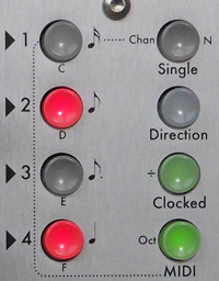 Pressing quickly reverses the current state, pressing and holding forces that state on and others off. SingleWhen set only one switch is allowed on at a time. Setting one switch clears the others and MIDI Notes have a Highest Note action. When clear multiple switches may be on. When held the red pushbuttons show or set the shift register length (N). DirectionWhen set the normal direction (1 to 8) is reversed (8 to 1) When held the red pushbuttons show or set the direction mode: