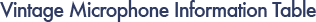 Here you will find information about a variety of vintage microphone models, organised by manufacturer. Clicking on a model number in the left hand column that is a link will open a popup with various data on that model. To purchase a cable that will work with a microphone in the list, simply click on the cable name next to the microphone model number(s).