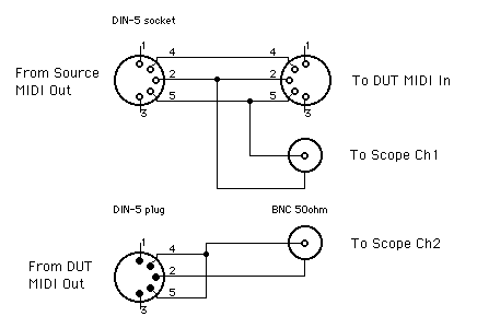 Hardware DelaysThese are normally small and are really a pulse width distortion of a few microseconds. They are caused by connecting several pieces of equipment together in a daisy chain using the MIDI Thru ports. When MIDI was first introduced there were two types of opto-isolator available: slow and cheap or fast and expensive. Needless to say the cheap ones were often used and such equipment is incapable of more than three Thru connections. The slow opto's transistor has a different turn on and turn off time so that at each successive stage the data is distorted until it becomes unrecognisable by the next receiver. The price of opto-isolators has come down a lot, helped by the large use in MIDI equipment, and the slow grades are only now used in the cheapest equipment. All opto-isolators have similar pinouts so it may be possible to upgrade some equipment. Software DelaysThese arise from different causes and may range from 0.35ms to 100ms, the latter is an extreme example, but illustrates how bad poorly designed software has been known to be. Worse still some delays vary considerably. Bottleneck Delays are caused by trying to pump too much data down a MIDI cable. It is not realistic to attempt to pump 16 channels of data down one cable simultaneously. That implies a 15ms delay for something. When merging data, if two notes occur at the same time one will be forced 1ms behind the other. Sharing a cable with MIDI Timecode may cause problems as the data can only fit in the gaps between Quarter Frame messages. These delays may be minimised by reorganising the routing so that less data is on each cable. Share the load. Latency Delays: sometimes the equipment is busy with another task when the MIDI data is received and does not respond immediately. Personal computers always have screen and disk tasks as a priority over communications so will never perform as well as a dedicated piece of hardware. Some are worse than others... Processing Delays: any device that receives MIDI data, alters it in some way, and then retransmits it causes a delay of at least 0.32ms plus the actual processing time. If the device has to receive a complete MIDI message before deciding what to transmit, e.g. velocity remapping, then the total delay may exceed 1ms. Software based patching systems that incorporate merging often introduce delays and may not function at all under heavy traffic conditions. If possible MIDI data processing should be done by the end receiving device or not in real time at all, otherwise processors should only be patched in as and when required. MultiPort Delays are probably the worst sort because they are caused by all of the above as well as an architectural flaw! The so called "fast" interfaces transmit data between a computer serial port and an external "multiport" interface, but only at a rate x2 or x4 that of normal MIDI. This creates an illusion of working, but under busy conditions or with a large number of ports fails dismally. The larger the system the worse the performance. These devices have recently moved over to USB which although another factor of 4 faster still does not solve the problem. Clock rate is not the same thing as data throughput. There is no substitute for multiple MIDI ports directly on the computer bus and a hardware routing system. Scanning Delays All equipment controls are scanned by a microprocessor, some faster than others. It is common to scan knobs at about 10ms intervals with some special controls, e.g. Pitchbend, faster at about 5ms. Scanning too fast may generate too much data which then causes a further delay as the receiving device tries to keep up. A keyboard player automatically compensates for the scanning delay (you don't actually know when the switch contact is detected), but MIDI guitars and audio to MIDI triggers causes problems because any delay is immediately obvious. Analogue synthesizers and MIDI to CV converters usually employ a scanning system to update and refresh their outputs. Some are much better than others, beware of manufacturers that do not specify these times. Scheduling Delays: most computer based sequencers operate on an internal time interval, usually around 2.5ms. If the tempo is accurate to several decimal places this technique is undoubtably used and any MIDI event that misses one interval has to wait until the next causing a quantisation dependent on how busy the sequencer is. One very popular piece of software is incapable of getting a note within a couple of its own intervals from the clock that caused it! Tell the software producer that accurate timing is more important than flashy graphics. Inefficiency Delays: it is possible to pack MIDI bytes stop bit to start bit without a gap, but some equipment is just too poorly designed to manage it. The 6850 UART was used a lot in early designs even though it was obsolete and in the Atari ST computer it was even made to share an interrupt with the keyboard. Not that PCs are any better, the MPU-401 is also 6850 based and is normally used as a dumb UART. Cheap gadgets often use microcontrollers at slow clock rates to save power. If it's in a plastic box, has phantom powering via MIDI or has an external wall wart PSU it doesn't belong in a professional installation. How to Measure MIDI DelaysDelays may easily be measured with a dual beam oscilloscope and a couple of cable adapters. If moulded MIDI cables are used it is difficult to get a probe onto the wires and as MIDI is a current loop no voltage will be seen until the loop is connected. A simple adapter can be made from two DIN sockets by wiring pins 2, 4 and 5 together and this is placed inline between a MIDI Out and a MIDI In. To look at a MIDI Out without a load it is even simpler, just short pins 4 and 5 together and connect the probe to that point.