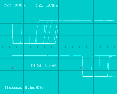 The trace illustrated above shows a MIDI Out delayed by 0.6ms from the MIDI In. As the device does not read the data until the end of the first byte this breaks down into 0.32ms transmission time (which is constant) plus 0.28ms processing time. If the processing time varies there will be a spread of delays on the second trace and if that exceeds 0.5ms this will start to effect critical timings in rhythmic music. The delay shown is quite respectable, but be prepared for an order of magnitude worse! ← Table of Contents | Next: MIDI Long Haul → |